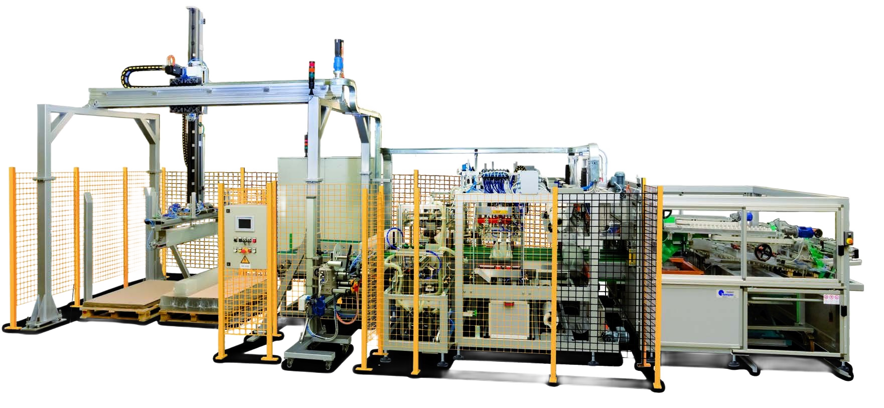 Automatic lines for the packing of glass tubes for the pharmaceutical and lighting industry. The tubes are counted, stacked and wrapped with shrink film on the ends.