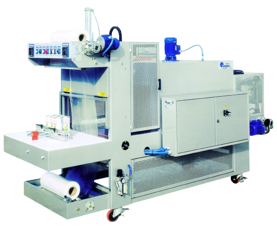 Semiautomatic monoblock line for packaging any product with or without support, with manual loading of the product on the working top with Polyethylene film.